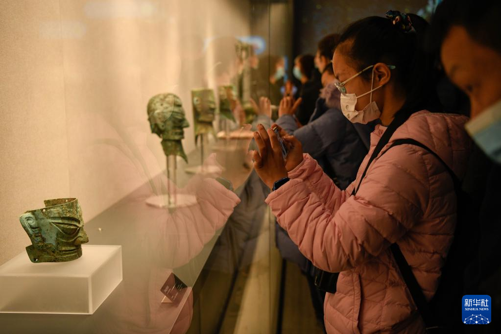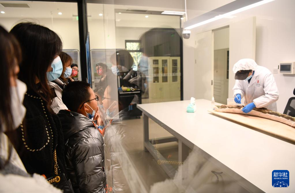2022年1月1日,游客在三星堆博物馆开放式文物修复馆内观看象牙修复过程。