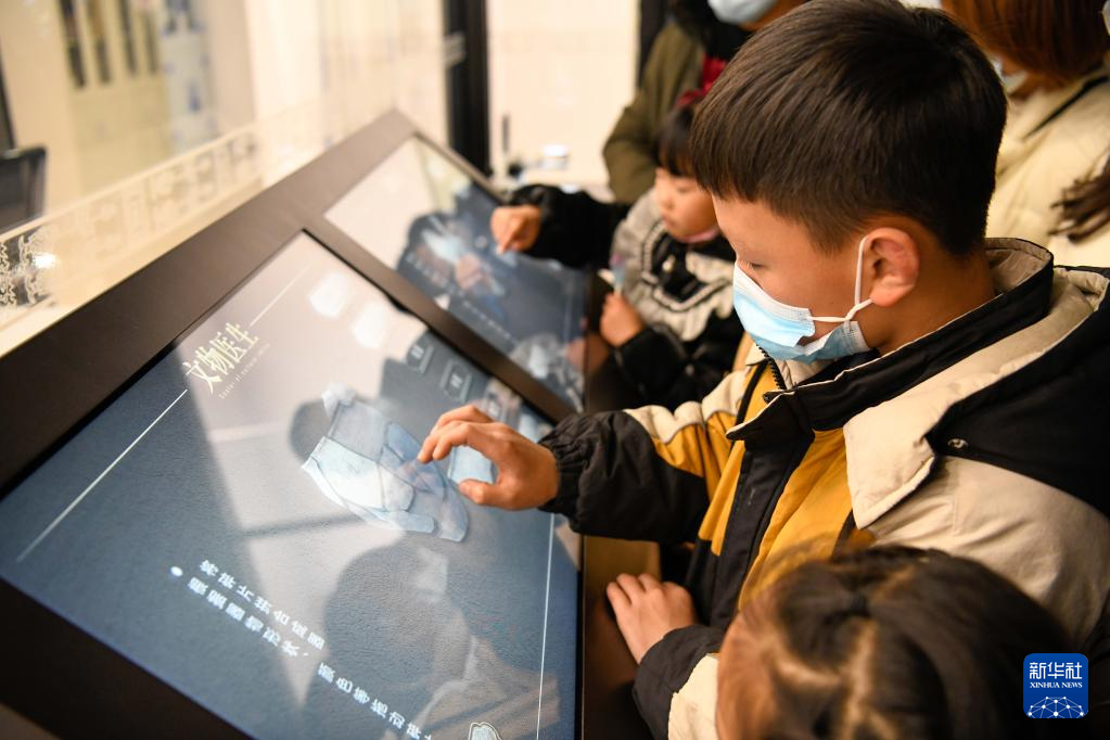2022年1月1日,小朋友在三星堆博物馆开放式文物修复馆内通过互动装置体验文物修复。