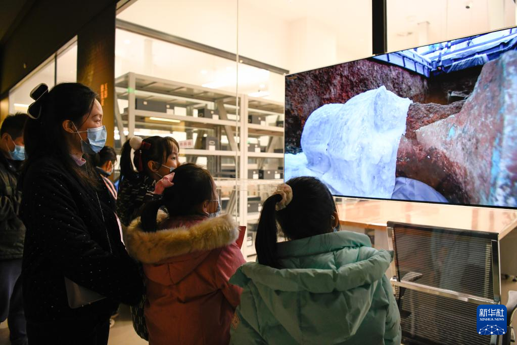 2022年1月1日,游客在三星堆博物馆开放式文物修复馆内观看三星堆祭祀坑文物发掘影像资料。