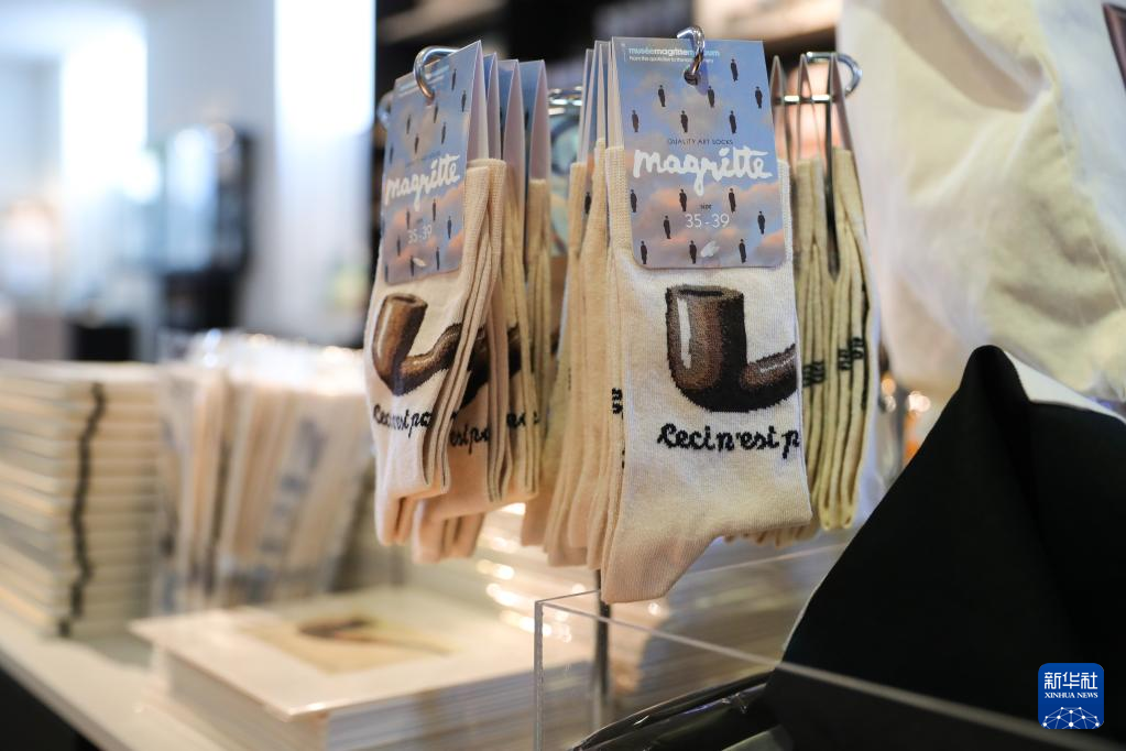 这是5月15日在比利时布鲁塞尔的马格里特博物馆的纪念品商店拍摄的文创产品——以勒内·马格里特的绘画作品《形象的叛逆》为灵感制作的袜子。