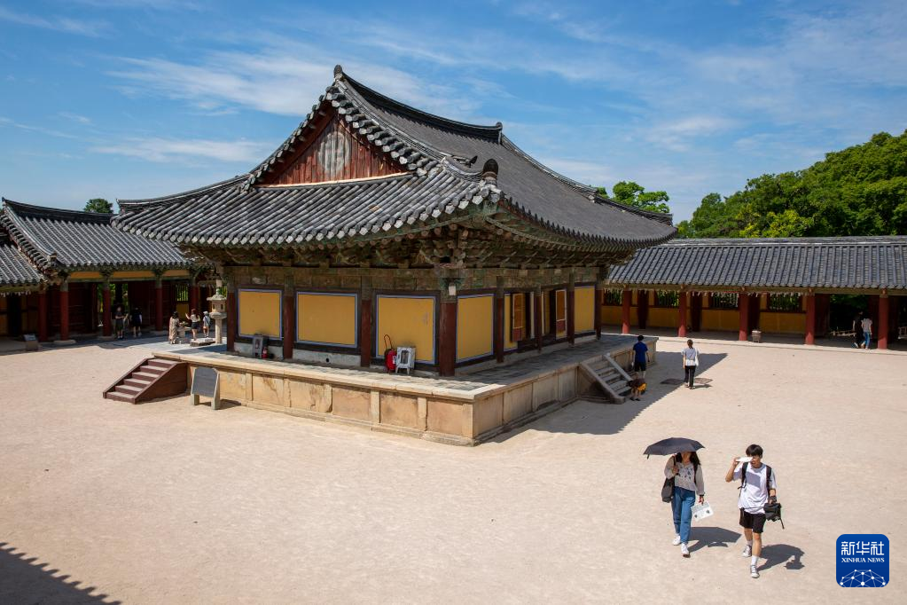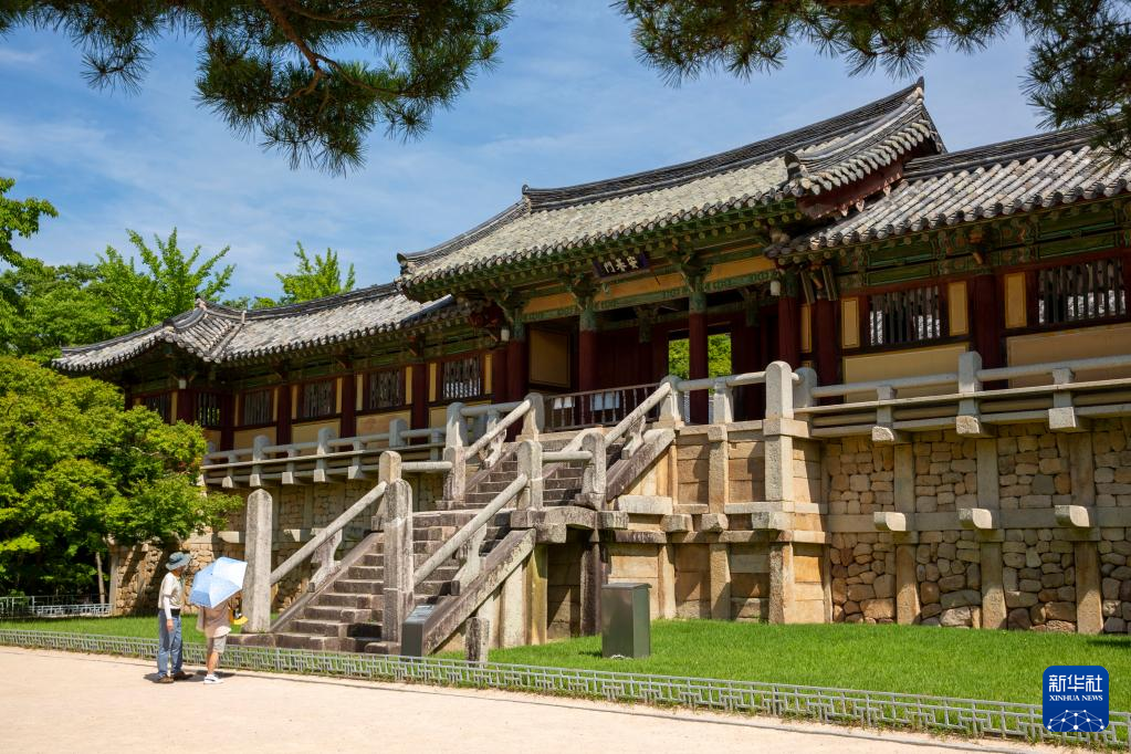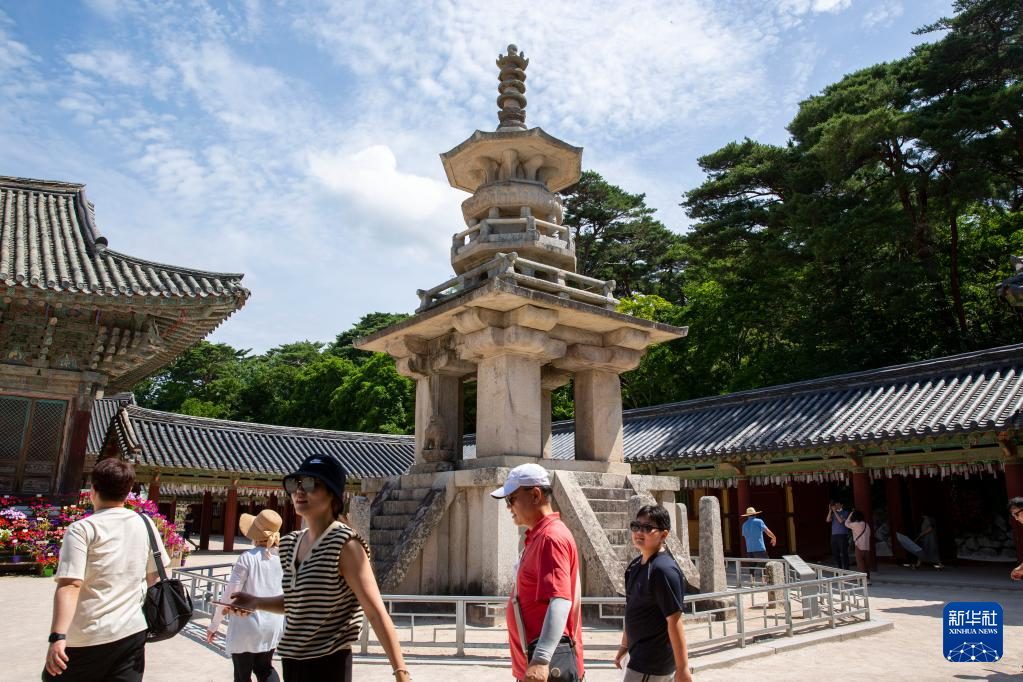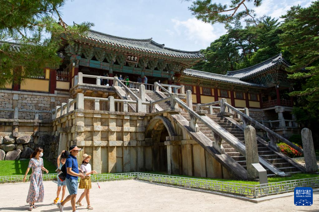 7月3日,游客在位于韩国庆州市的世界文化遗产佛国寺内参观。