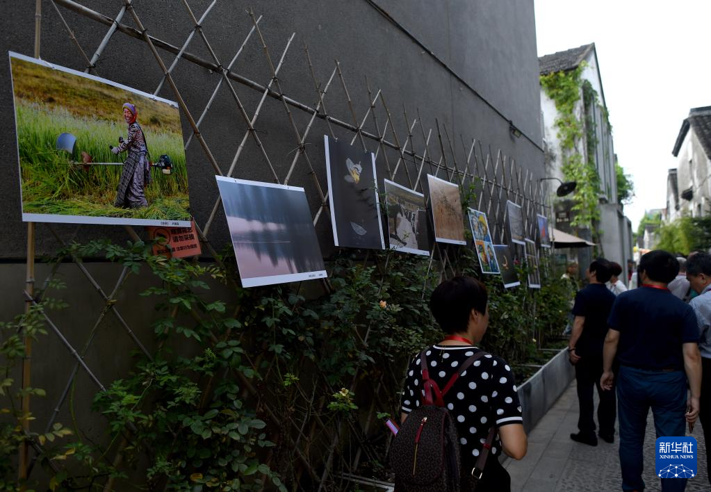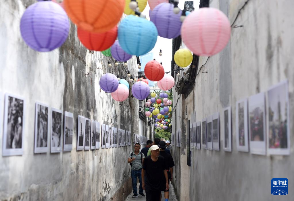 这是湖州市小西街历史文化街区展出的长三角优秀摄影师作品(7月16日摄)。