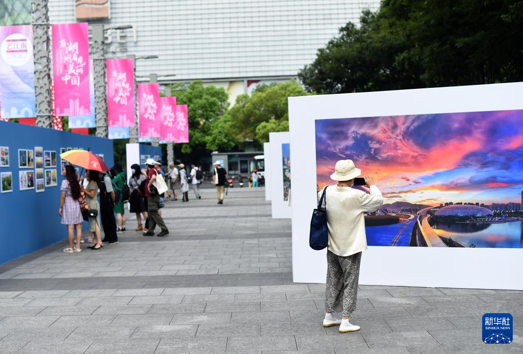 7月16日,观众在湖州市爱山广场观看“共富共美看湖州”全省摄影展。