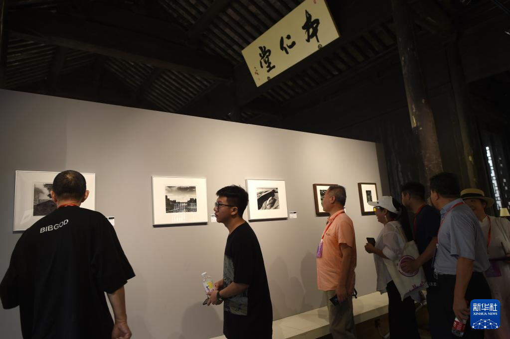 7月16日,人们在湖州市小西街历史文化街区观看展出的黑白银盐摄影作品。