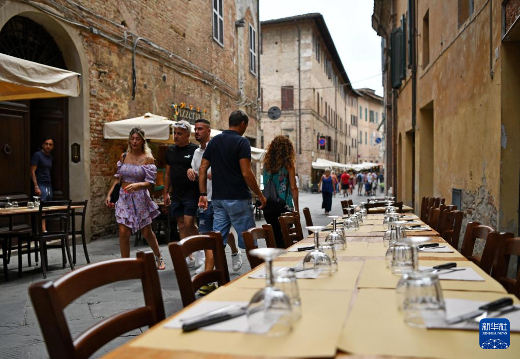 8月15日,游客们在意大利锡耶纳街头行走。