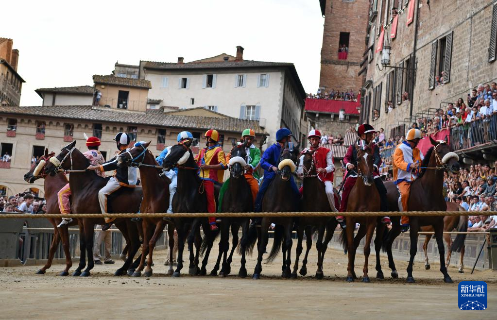 8月15日,骑手在意大利锡耶纳田野广场上参加赛马节热身赛。