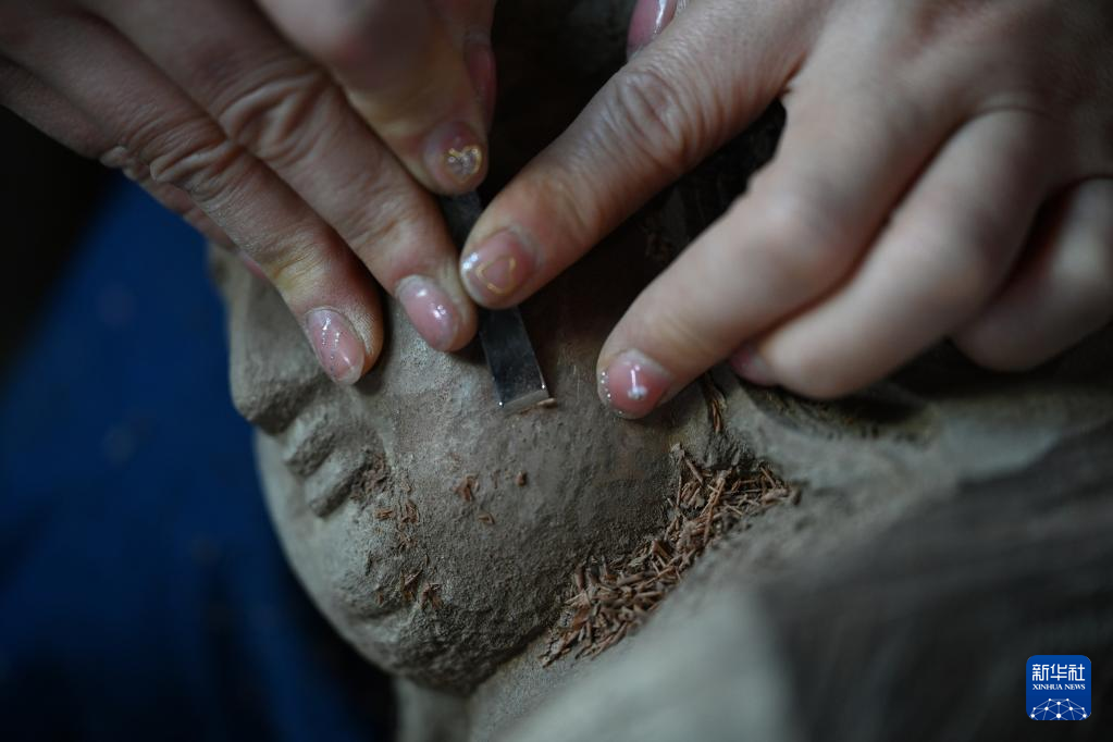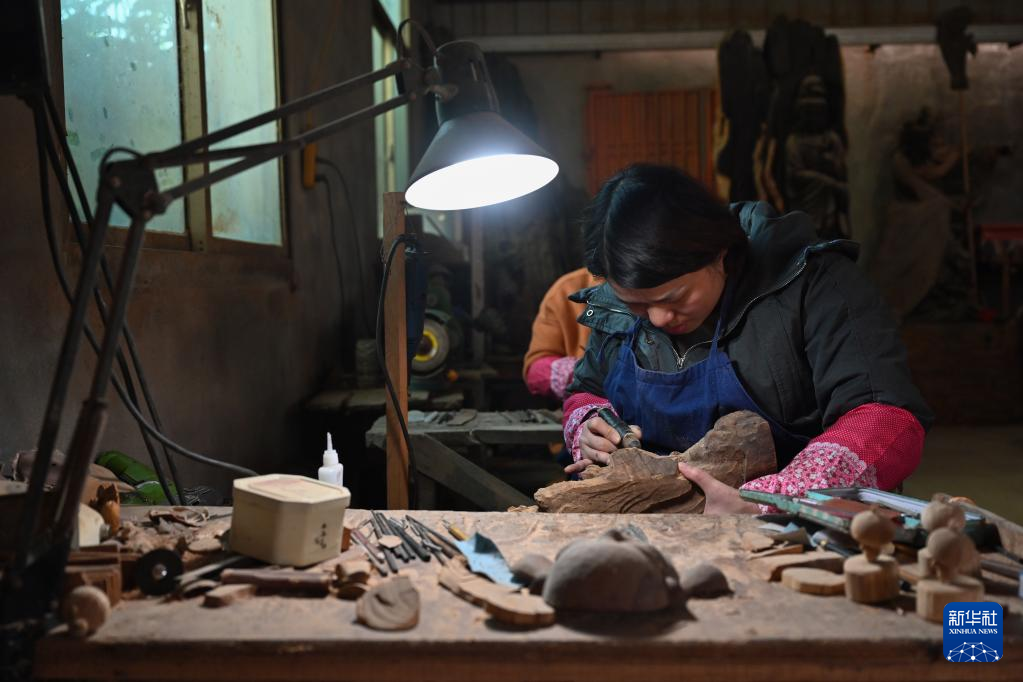 12月9日,陈志华的学徒陈欢在莆田市秀屿区根艺博物馆内给已初步成型的木雕修光。