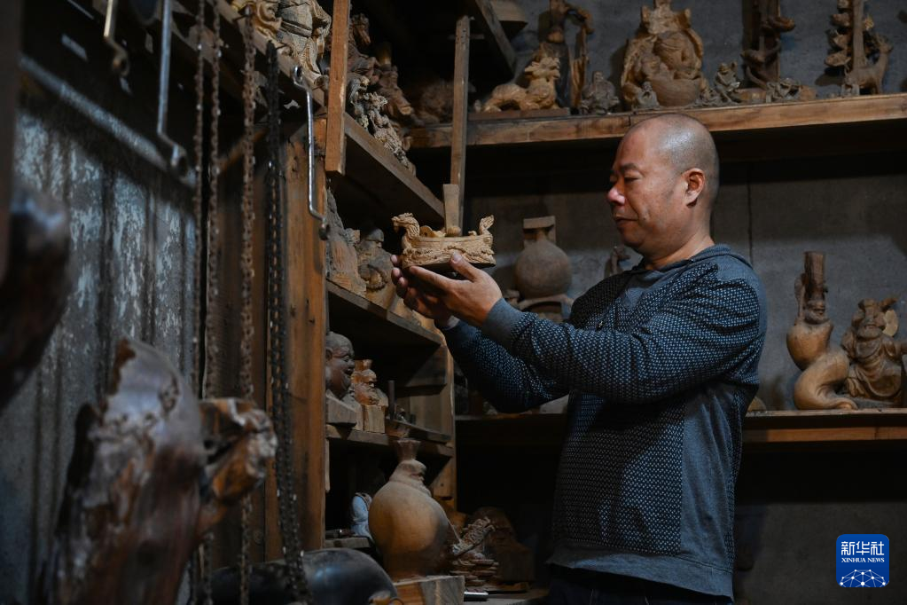 12月9日,陈志华在莆田市秀屿区根艺博物馆内查看根雕成品。