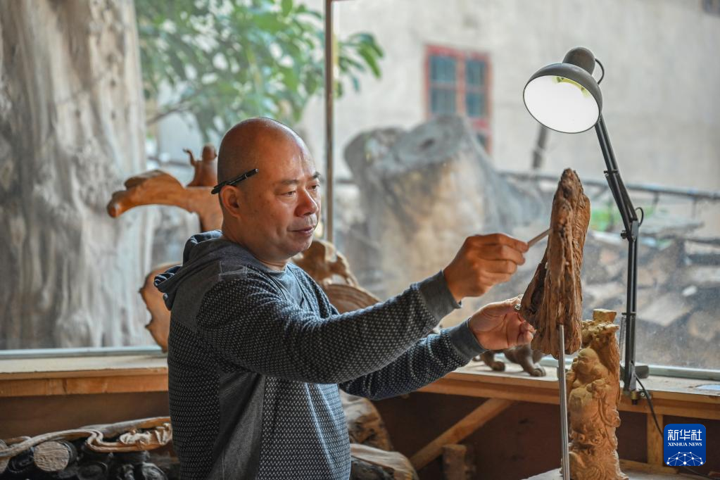 12月9日,陈志华的学徒在莆田市秀屿区根艺博物馆内制作根雕。