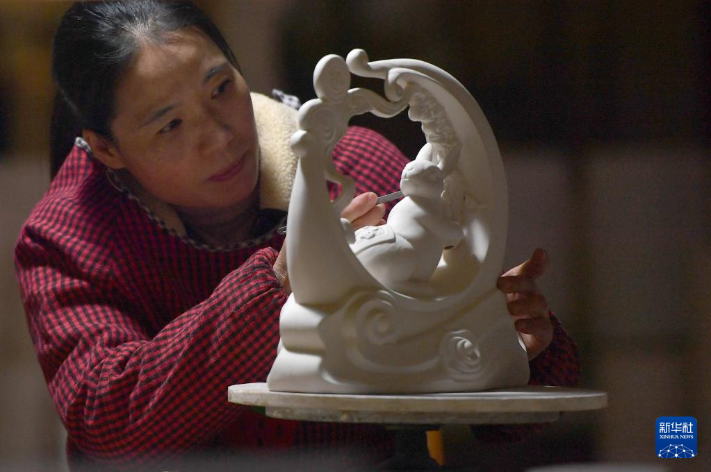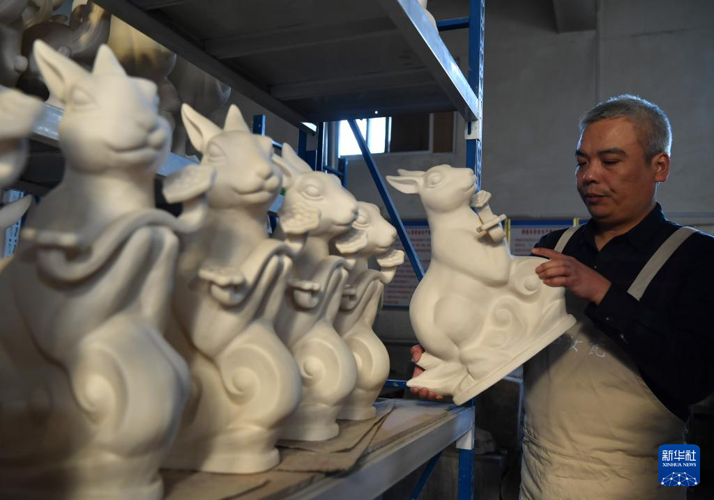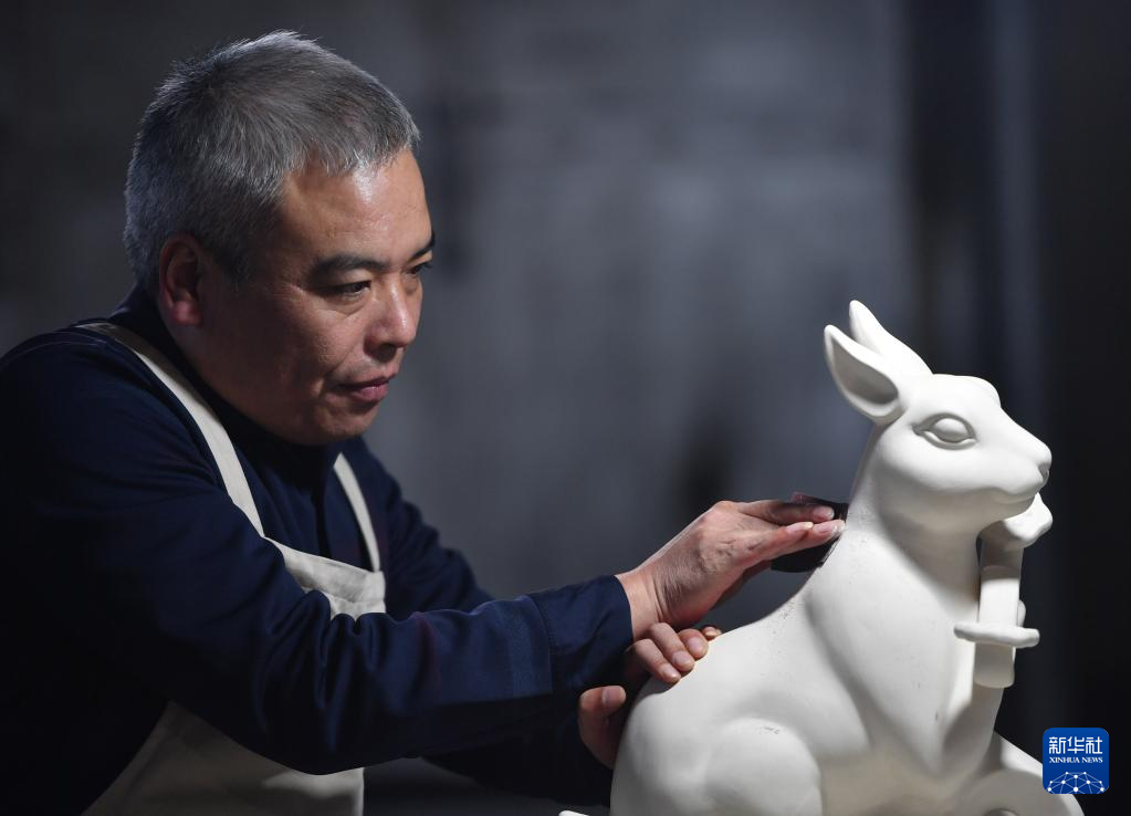 1月19日,在宝丰县张八桥镇一家汝瓷生产企业,汝瓷艺人在制作汝瓷生肖兔泥坯。新华社记者 李嘉南 摄