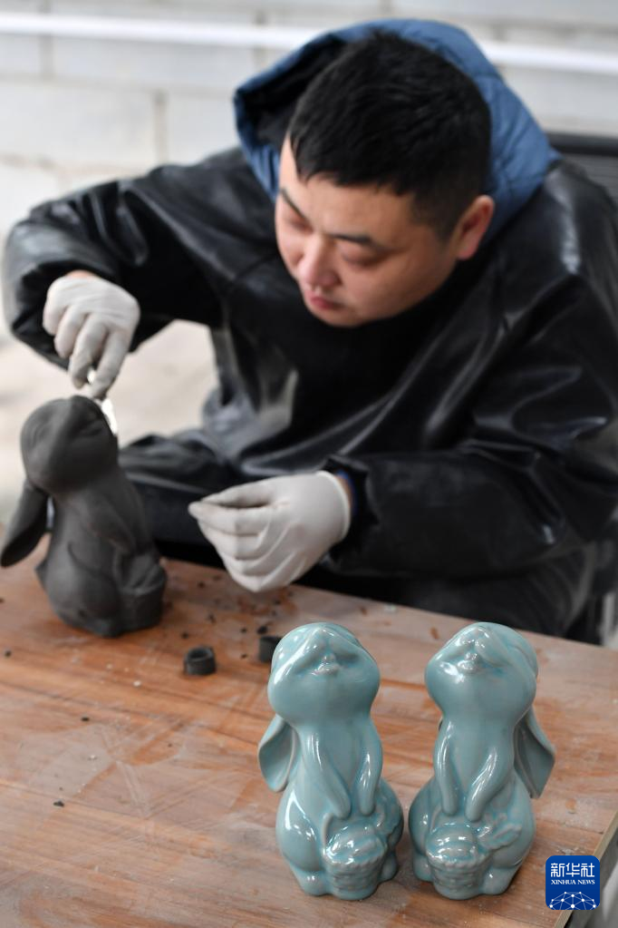 农历兔年春节将至,河南省宝丰县的汝瓷艺人以兔为题,创作造型各异、栩栩如生的汝瓷生肖兔作品,迎接新春佳节的到来。