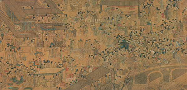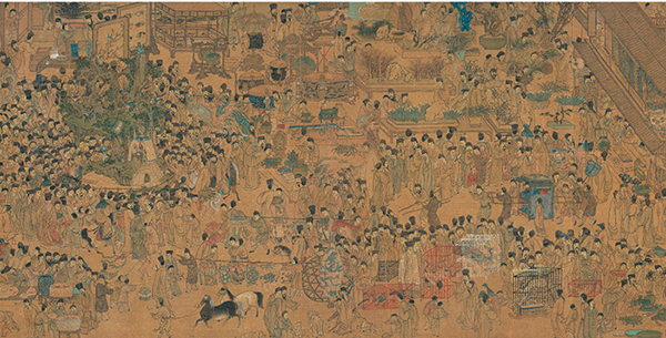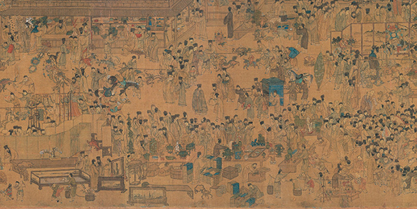明代的另一佳作《上元灯彩图》描绘了明朝中晚期元宵节期间南京地区的街市景致,该图所绘地段应是三山街至秦淮河畔的繁盛景象。伴随着长卷的展开,我们仿佛也行走在市井中,跟着熙熙攘攘的人群,逛着鳞次栉比的商铺,在叫嚷声中感受着人间烟火。可以清晰看到,图中有荷花、南瓜、大象、狮子等神兽、瓜果等各种形式的彩灯。引人注意的是,图像中间还有一座青绿色的山,此为“鳌山巨灯”,此灯上布置各种灯彩,燃灯数万盏。巨灯吸引了不少观者,被挤得水泄不通。在此灯的周边则遍布着各式各样的货摊,有字画、屏风、瓷器、青铜器、书籍、盆景,货物之齐全也从侧面反映出明代市井生活的繁华。这是一次元宵灯市与市场贸易相结合的集市活动,在节庆之时,或许摊主真可大赚一笔!