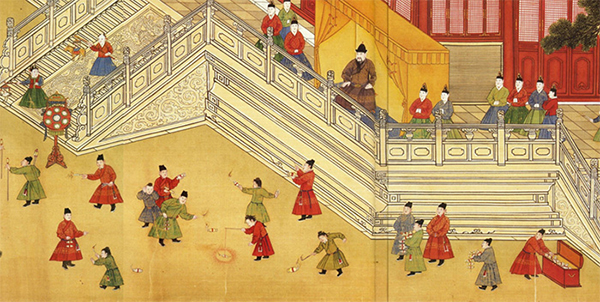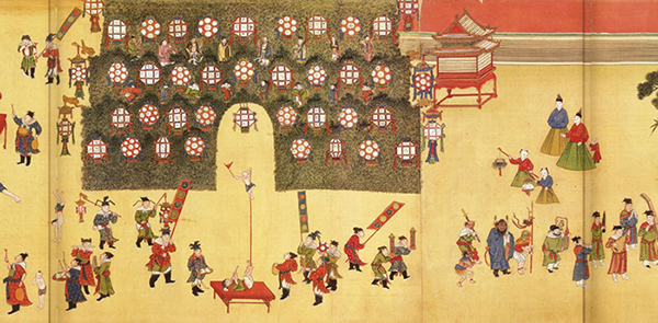 明太祖朱元璋建立明朝后特别重视上元节,刘侗和于奕所著的《帝京景物略》中写道:“而上元十夜灯,则始我朝。太祖初建南都,盛为彩楼。招徕天下富商,放灯十日。”而后明成祖虽迁都北京,但元宵旧俗依然沿袭。明宪宗时期的《元宵行乐图》为我们展现了500多年前紫禁城内皇家过上元节的风俗景象。这一天,宫廷内张灯结彩,宫人们燃放爆竹、悬挂彩灯、表演杂耍、贩卖商品,朱见深作为观者从早到晚在宫中游玩,欢度元宵。