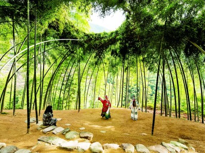 在竹资源丰富的桂林,有一组长140米的竹亭绵延在石灰岩地貌中,这是建筑工作室LLLab为“印象刘三姐”灯光秀现场设计的过渡性空间“竹林亭台楼阁”。最终的建筑是一组树冠与豆荚状的亭子,宛如从绵延的山脉中生长出来,与周围竹林和丘陵形成了有机互动,游客被迅速带入整个自然环境的氛围中去,获得亲切温暖的情绪感知。