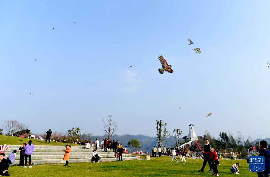 2月27日,人们在湖北省宣恩县仙山贡水旅游区的一处草坪上放风筝。