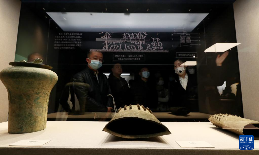 3月14日,参观者在观看一组青铜甬钟展品。