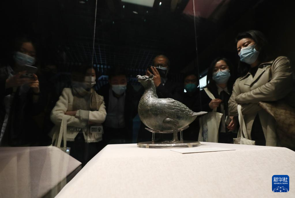 3月14日,参观者在战国鸟形尊展柜前驻足观看。