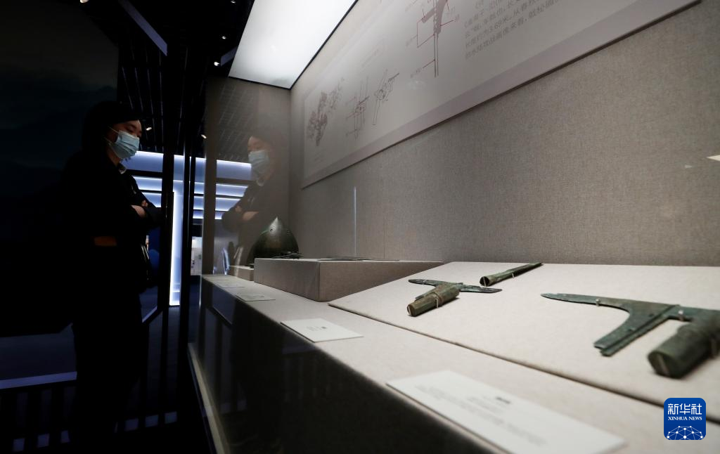 3月14日,参观者在一组青铜兵器展品前驻足观看。