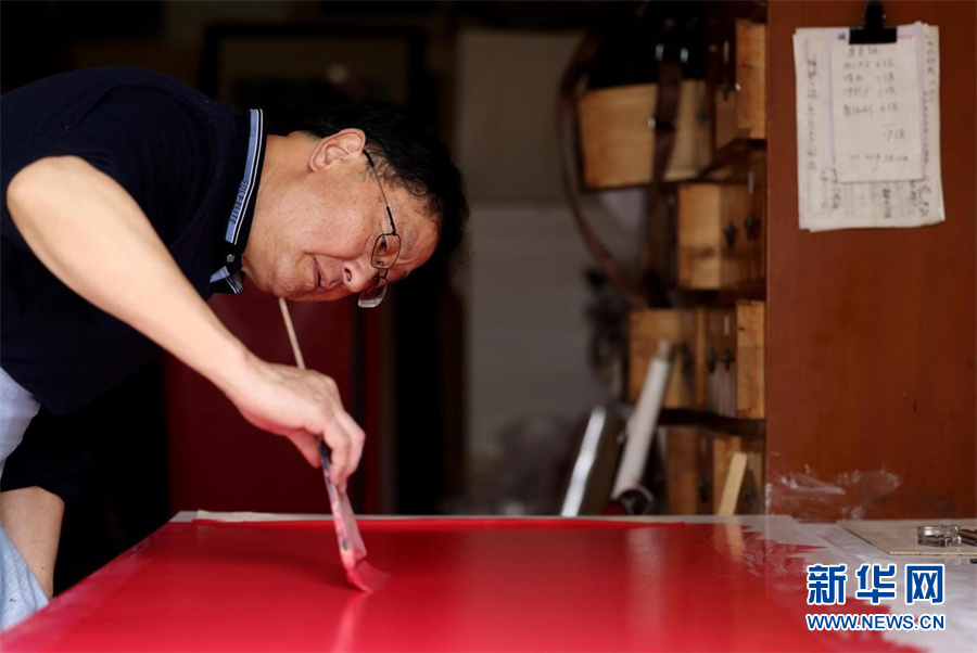 近日,宫廷描金纸省级非遗传承人范发生在工作室进行纸张染色。