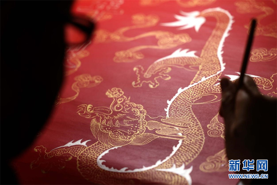 近日,宫廷描金纸省级非遗传承人范发生在进行描金纸画稿拷贝。