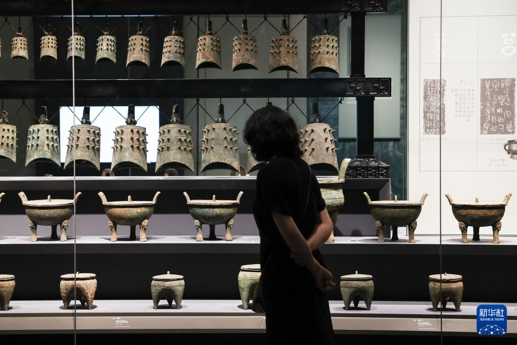 5月16日,观众在参观“海岱日新——山东历史文化展”展出的商周时期青铜器。