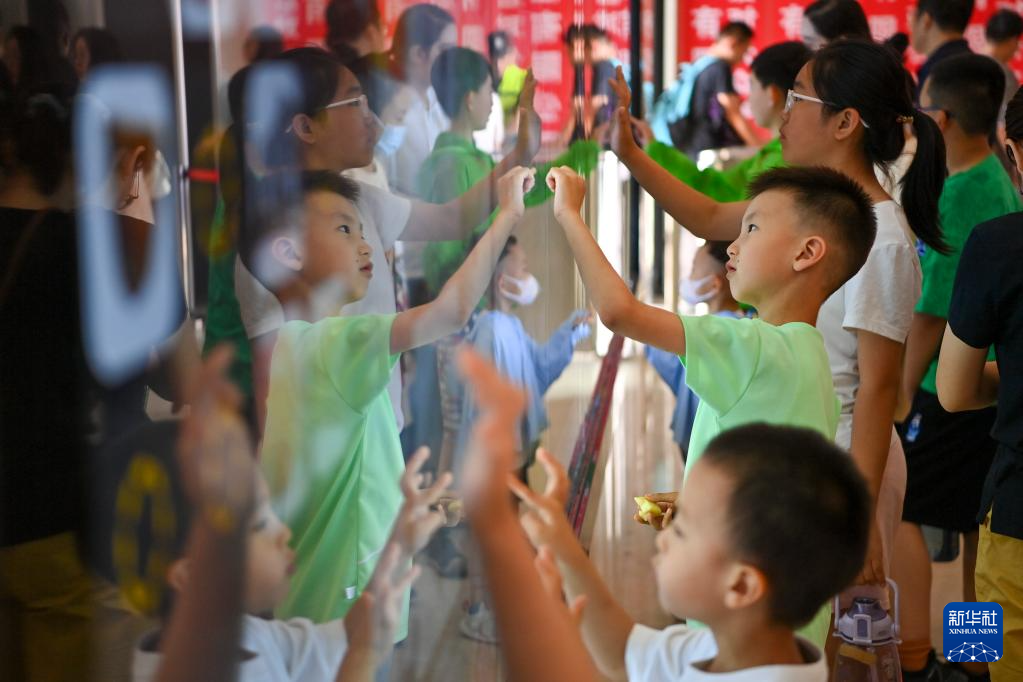 7月1日,在山西地质博物馆,小朋友们通过电子屏幕参与互动小游戏。