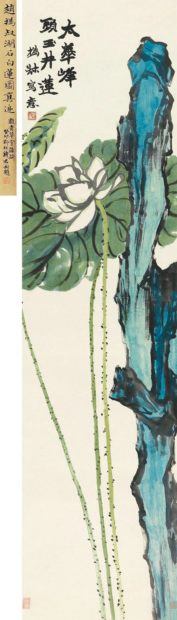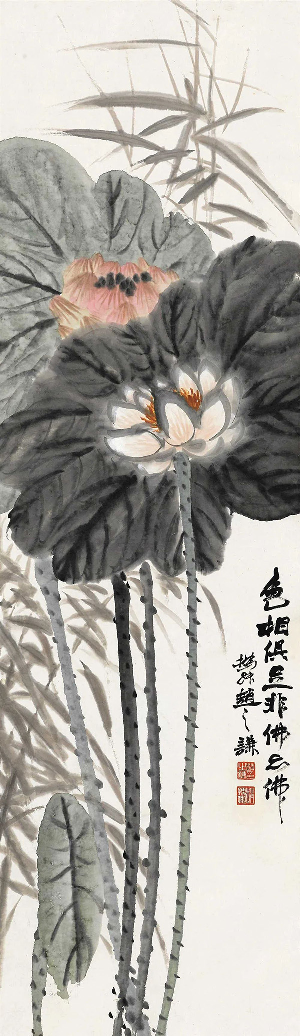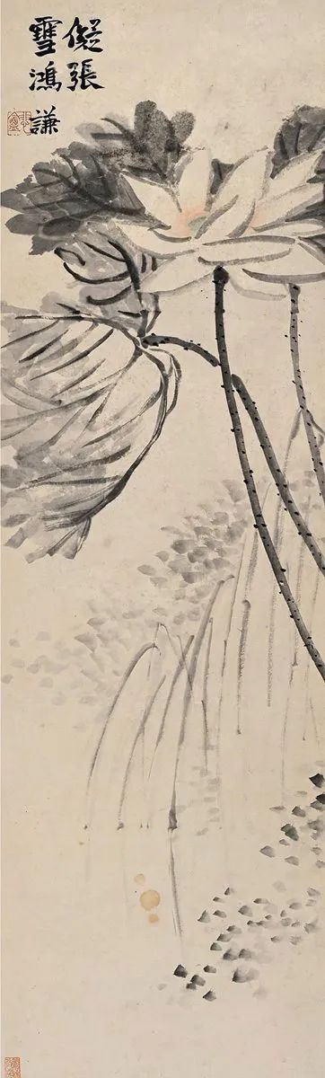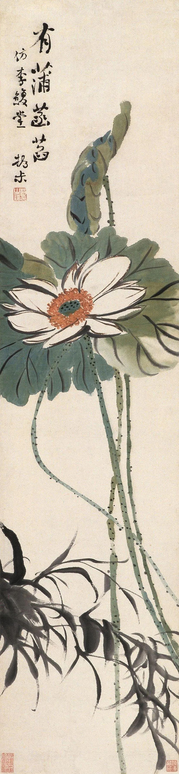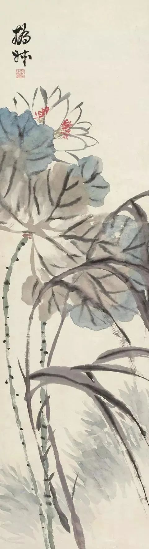 此幅作品采取了极为夸张的手法,取立幅,竖绘荷茎,挺拔向上,从纸底直至纸顶,上端着两朵荷花,相互呼应,婷婷俊秀。