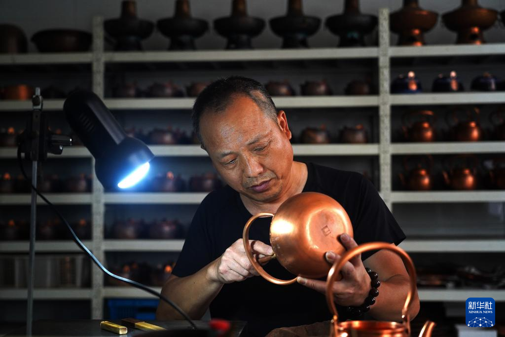 在位于江西省贵溪市的江西中鼎金属工艺有限公司的车间里,匠人们在雕刻铜壶(7月13日摄)。