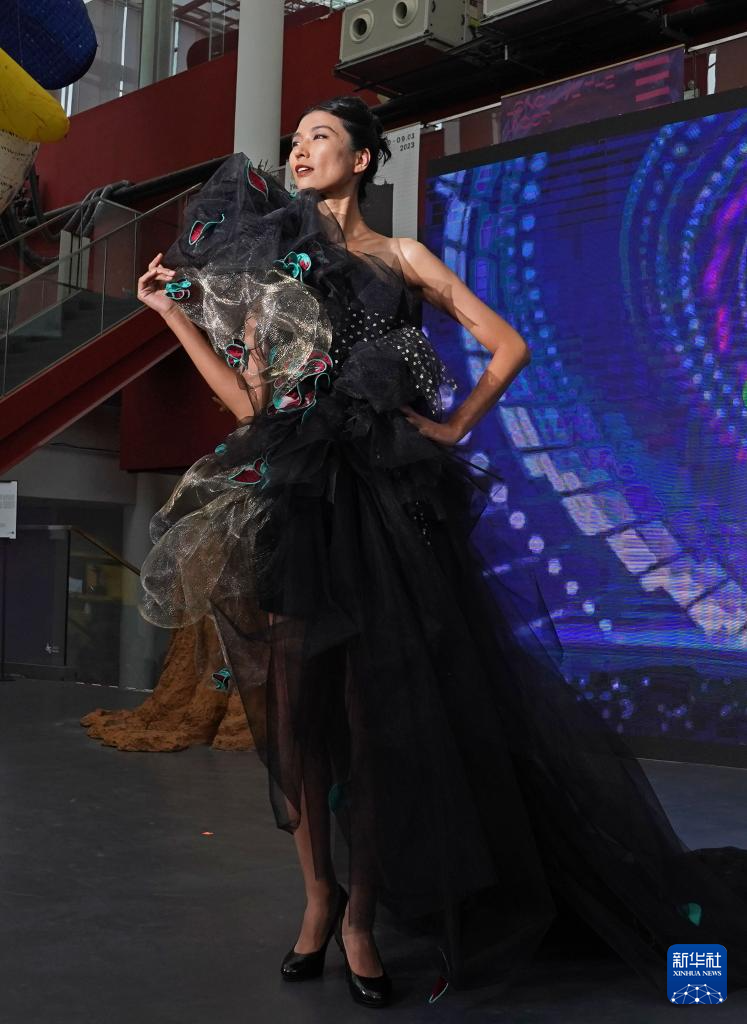 8月15日,模特在艺术节开幕式上展示用废弃布料设计制作的礼服。