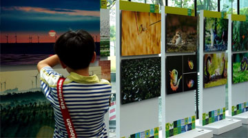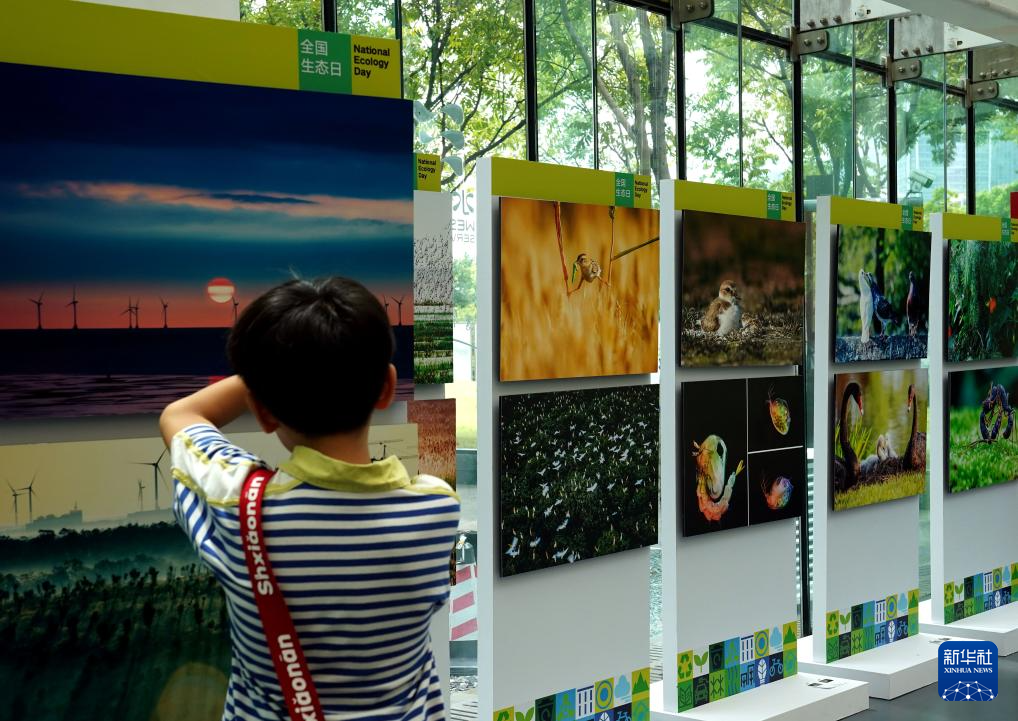 8月15日,观众在艺术节现场参观生态主题摄影作品。