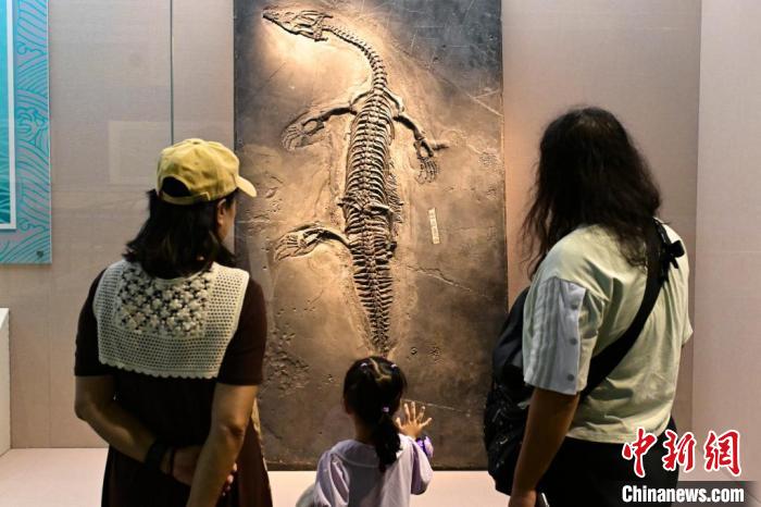 9月19日,北京,由国家自然博物馆与贵州省地质博物馆共同主办的“龙跃黔海——贵州三叠纪的海洋世界”展览在国家自然博物馆开展。该展共展出邓氏贵州鱼龙、关岭鱼龙、胡氏贵州龙等鱼龙化石标本50件。图为家长带小朋友参观杨氏幻龙化石。中新社记者 田雨昊 摄
