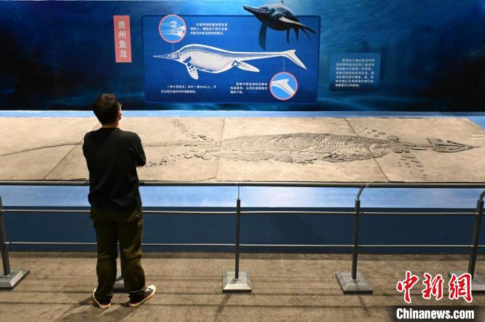 9月19日,北京,由国家自然博物馆与贵州省地质博物馆共同主办的“龙跃黔海——贵州三叠纪的海洋世界”展览在国家自然博物馆开展。该展共展出邓氏贵州鱼龙、关岭鱼龙、胡氏贵州龙等鱼龙化石标本50件。图为参观者在观看梁氏关岭鱼龙化石。中新社记者 田雨昊 摄