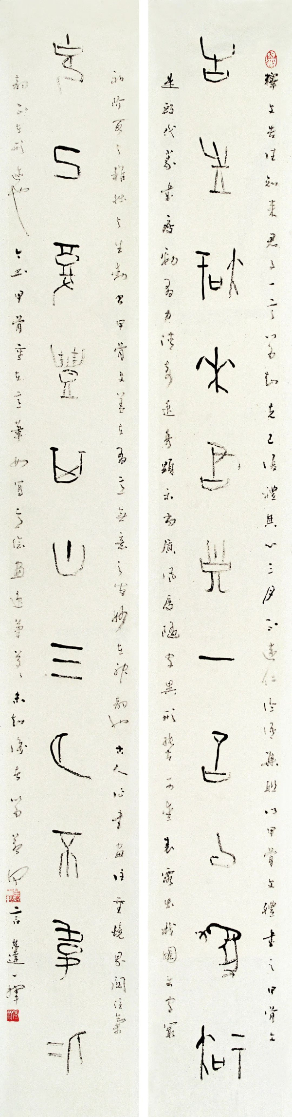 书法,从本质上说是一种内涵丰富的综合艺术。要具备书外功夫,必须同时涉足其他姐妹艺术,知其个中三昧。将不同艺术内容和形式美融入书法艺术,形成多维视野,显现时代风采、时代美感。我从事书法、篆刻创作,亦喜绘国画,喜读文学作品,喜听音乐,它们可加强我的综合美学内涵。实践使我深有体会,读史使人充实,哲学使人明智,美学使人旨趣高尚。孔子曰:“君子和而不同,小人同而不和。”一个艺术家若能有机会做点“经世学问”,则有利于从“小我”进入“大我”,从个人视野的单维性,进入社会色彩斑斓的多维性探索,真正做到纵横求道,事业成功。