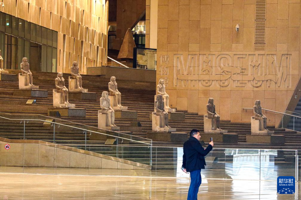 11月20日,一名游客在位于埃及吉萨省的大埃及博物馆大厅拍照。