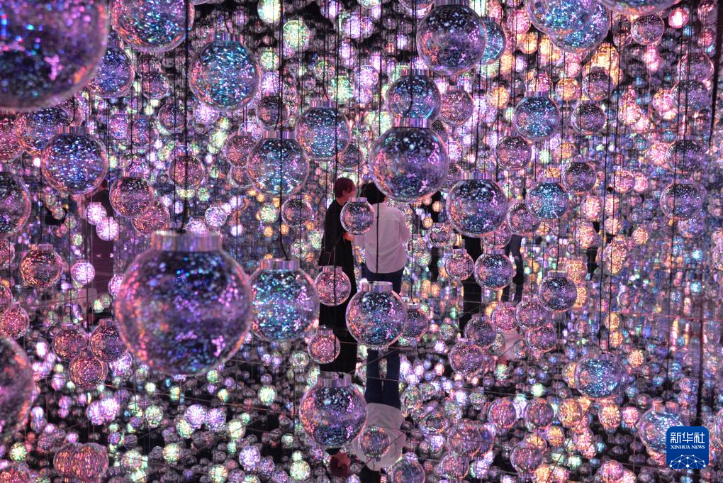 11月20日,在日本东京“teamLab无界”美术馆的媒体预览活动上,参观者体验艺术作品“泡泡宇宙”。