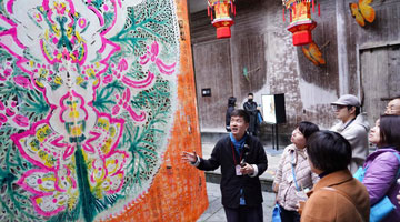 11月24日,在香港会议展览中心,导赏员讲解张大千作品《关山密雪图》。