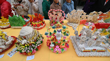 3月26日,在山东省滨州市沾化区大高镇枣木雕刻工坊内,木雕艺人崔树曾给学生们展示如何手工雕刻艺术品。
