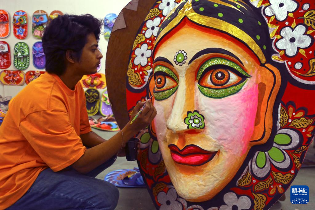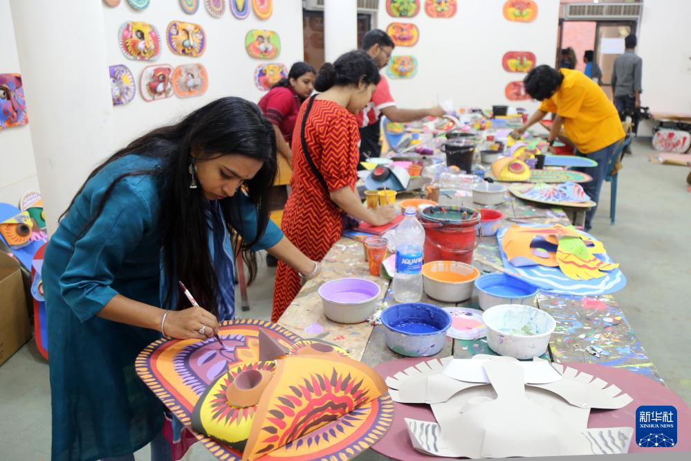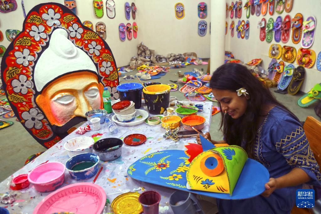 4月7日,在孟加拉国首都达卡,达卡大学的学生绘制孟历新年庆祝活动所需的工艺品。