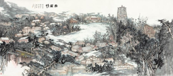 《燕园情》全作高82厘米、宽180厘米,画面以北大燕园未名湖、博雅塔为中心,将北京大学的全景图卷展现得淋漓尽致。画面布局左高右低,如一幅锦缎般自然铺展,烟霞流转其间,将燕园中的标志性景物一一呈现。博雅塔巍峨耸立,未名湖波光粼粼,百年讲堂庄重典雅,体育馆充满活力,北大西门庄严肃穆,华表挺拔俊逸。陈治以精湛的笔墨技巧,将这些景物巧妙地融合在一起,构成了一幅和谐统一、气韵生动的画面。