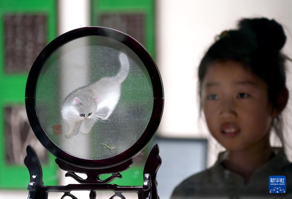 6月10日,小朋友在郑州商代都城遗址博物院里观看苏州园林美学展上展出的苏绣。