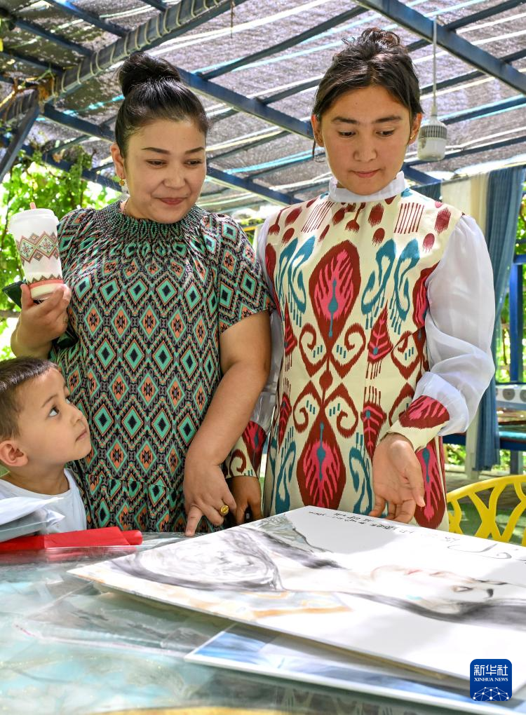 7月6日,在新疆克州阿图什市松他克镇阿孜汗村,村民在欣赏作品。