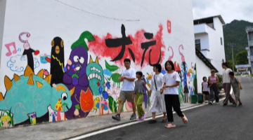 8月25日,大元社的孩子们和老师从村里一幅墙绘前走过。