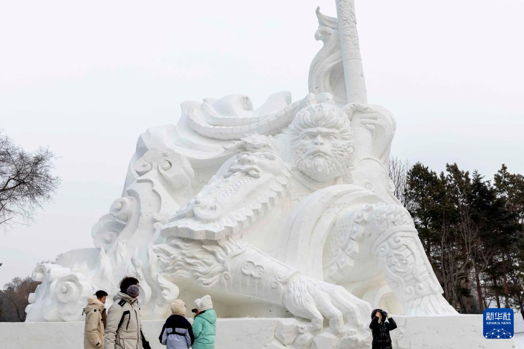1月13日,在哈尔滨太阳岛雪博会园区,游客在大型雪雕《悟空归来》前游览。