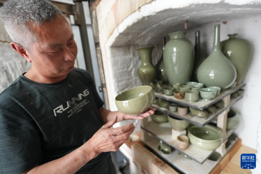 4月17日,施尚剑在位于慈溪市桥头镇的工作室查看一窑青瓷作品。
