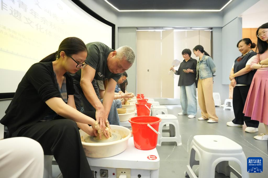 4月17日,施尚剑(左二)在慈溪桥头镇的一次青年活动中教青年拉坯。