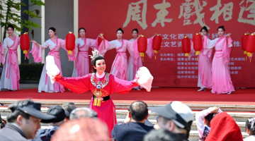 4月15日,在云冈石窟,身着传统服装的演员和游客互动。