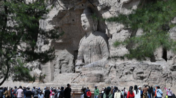 4月16日,在云冈石窟,游客摆出和大佛隔空“击掌”的姿势留影。