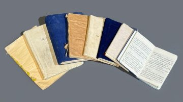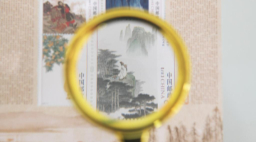 这是展出的淄博陶瓷琉璃博物馆藏清代白底烤花八棱琉璃笔筒(6月10日摄)。