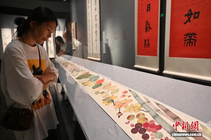 图为丁仁的《设色百果图》吸引参观者。中新社记者 陈楚红 摄
