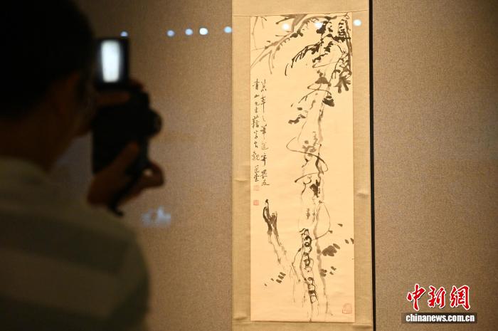 图为饶宗颐的《水墨藤木图》吸引参观者拍照。中新社记者 陈楚红 摄
